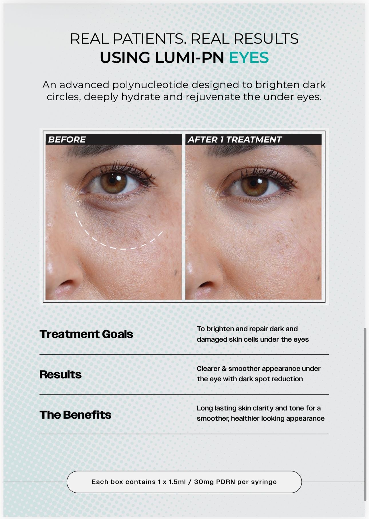 Renew the delicate under-eye region with advanced polynucleotide therapy. LumiFil PN Eyes delivers 30 mg of ultra-pure PDRN in a 1.5 ml syringe, formulated specifically for the peri-ocular zone to address dark circles, uneven tone and early signs of ageing.