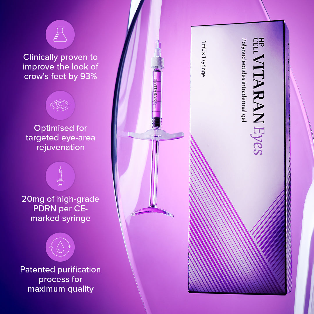 VITARAN Eyes is the latest addition to the hugely popular VITARAN polynucleotide range, which has been created in the perfect size for the more delicate under-eye treatment areas. Derived from highly purified salmon trout DNA, the treatment helps to both treat and restore the skin’s natural barrier and bring a rejuvenated look to the under-eye area.
